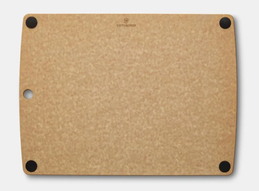 Doska na krájanie Victorinox All-in-One v elegantnom a tenkom prevedení prináša do vašej kuchyne maximálnu funkčnosť a štýl. Je vyrobená z vysoko odolného papierového kompozitu, ktorý nielen chráni čepele vašich nožov, ale je vhodný aj do umývačky riadu. Doska disponuje praktickou drážkou na zachytávanie štiav a odnímateľnými gumovými nožičkami na každom rohu, ktoré zabezpečujú stabilitu pri práci. Vďaka vysokej tepelnej odolnosti až do 175 °C ju môžete bez obáv použiť aj ako podložku pod horúce hrnce. Tento všestranný nástroj je ideálny na krájanie všetkého od pečiva až po šťavnaté mäso a skvele poslúži aj pri servírovaní priamo na stôl.