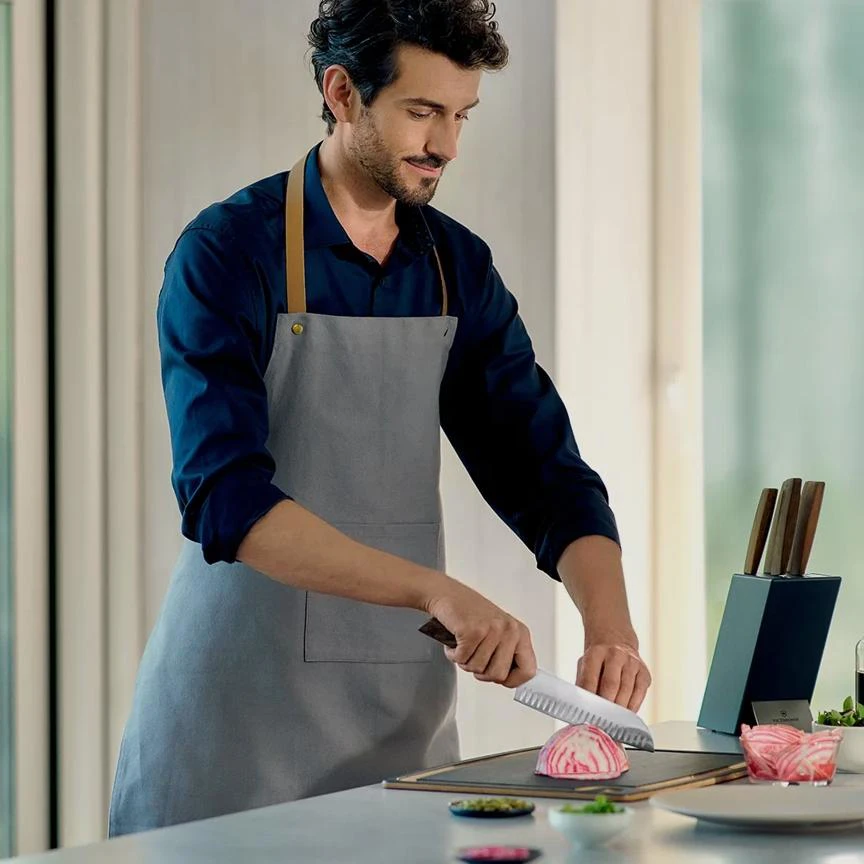Táto elegantná a tenká doska na krájanie All-in-One S premení každodennú prípravu jedla na príjemný zážitok. Je vyrobená z vysoko odolného papierového kompozitu, ktorý vyniká svojou dlhou životnosťou a šetrnosťou k čepeliam vašich nožov. Doska disponuje praktickou drážkou na zachytávanie šťavy a odnímateľnými gumovými nožičkami na rohoch, ktoré zabezpečujú stabilitu pri práci. S tepelnou odolnosťou až do 175 °C ju môžete bez obáv použiť aj ako podložku pod horúce hrnce. Údržba je mimoriadne jednoduchá, keďže materiál je vhodný do umývačky riadu.
