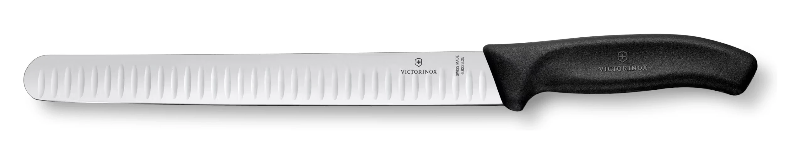 Profesionálny nárezový nôž s dĺžkou čepele 25 cm, ideálny na krájanie tenkých plátkov šunky, pečeného mäsa a údenín. Špeciálny oválny výbrus čepele zabraňuje lepeniu surovín na nôž, zatiaľ čo ergonomická rukoväť zaručuje bezpečný úchop a maximálnu kontrolu.