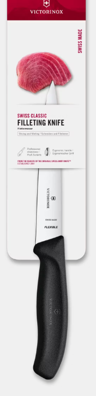 Filetovanie si vyžaduje sústredenie, cit a predovšetkým správny nástroj. Nôž Victorinox Swiss Classic prináša kombináciu všetkých troch vlastností. Vďaka svojej mimoriadne pružnej čepeli z nehrdzavejúcej ocele hladko kĺže pozdĺž kostí a pod kožou, čím zabezpečuje maximálnu výťažnosť suroviny a esteticky dokonalé výsledky.